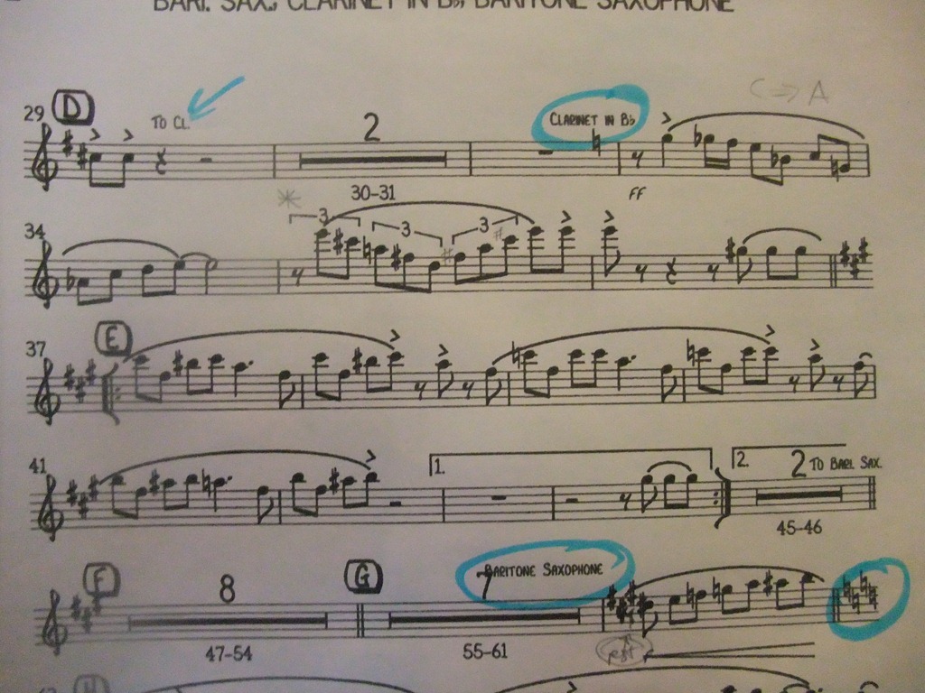 In this next example, I’m on bass clarinet. And my bass clarinet is the highly regarded Selmer Privilege keyed to a low C. Most of it is just flat out fun, but the first quarter note run is this fast, “Da, da, da, da, da, da”. Oh right, you can’t tell that way. Think about 210 beats per minute. It’s the fingering of D# to C# and then to B that gets me every time.