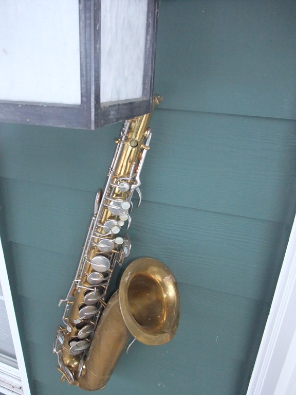 As you approach the door you our greeted by the obligatory beat-up sax. It’s an old Buescher instrument that was used for parts before it found it’s way to my hands.