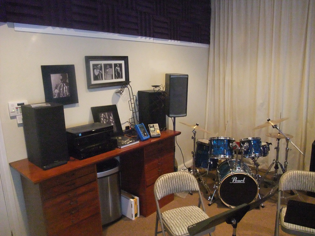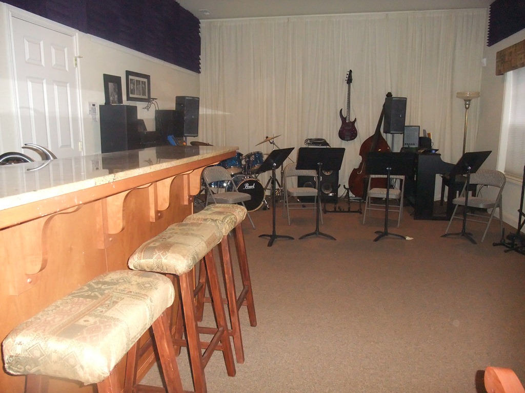 The first time we had the four-horn, eight piece jazz combo in the room, it was a bit loud. The room now has one wall covered with some cheapo muslin to help shape the sound. A high school director came up with that idea. The other three walls have Auralex Acoustics sound proofing to help with the bouncing sound or echo stuff. I got them during a music123.com 50% off sale. The windows have the pleated shades to keep sound from bouncing of of those surfaces. And the wet bar was a must have to. <smile>