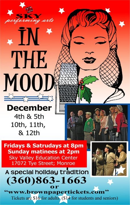 I’m Jones’ing for some Big Band and the In the Mood theater production is doing their last weekend of the show in Monroe, WA. I invited late to the gig after I already had two other gigs, so I will have done 4 of the 6 show. “In the Mood,” written and directed by Terry Simon, is a re-creation of a USO-style show as might have been presented to U.S. troops near the close of WWII. This year’s version is set in the Pacific, where the Sky Notes Orchestra, a seventeen-piece big band under the direction of Bruce Gallagher, along with seven singers, brings the sounds of Benny Goodman, Glenn Miller, Duke Ellington, and the Andrews Sisters. The show also features the vocal and comedic talents of Greg Norgaard, L. Sam Samano, Robin Hilt, Ellen Powell, Rick Wright, and Brianna Underhill.