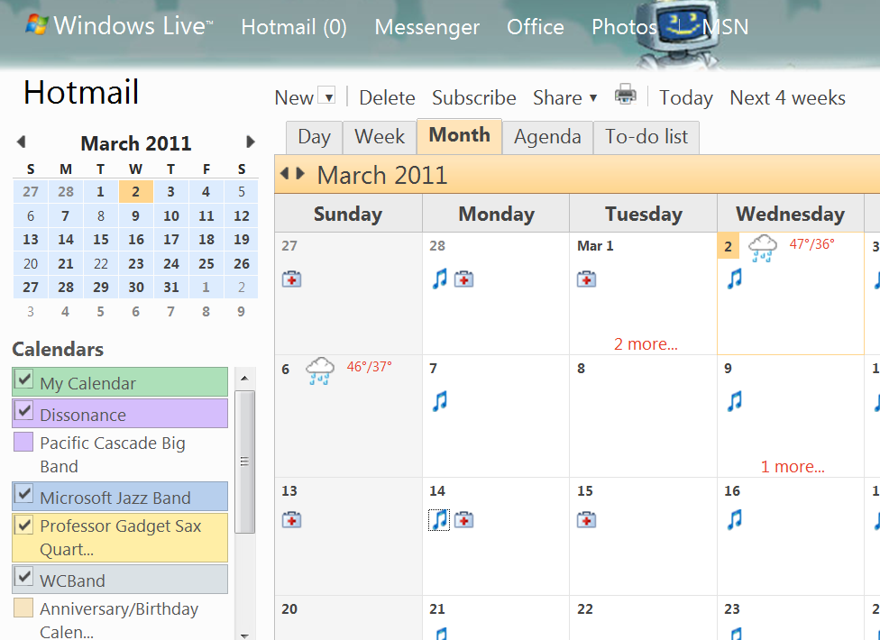 And here’s how I use Windows Live Calendars to track family and band events. Note I use jewels instead of text for many reoccurring events.