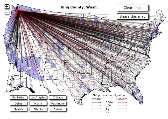 imageForbes provides a fascinating snapshot of what the status of movement is for anywhere in the United States in the Map: Where Americans Are Moving article. As I look at this map (more black than red) I infer that more people are move to rather than from the county I live in (based on IRS stats). Secondly there is strong secondary move to adjoining counties, I’m guessing due to the high taxes in King county.