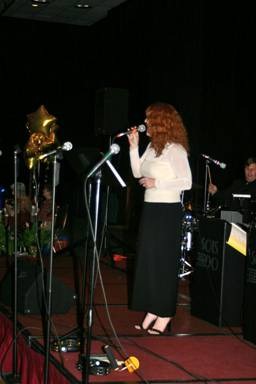 The net improvement of these two moves was striking – no more obstructions, a better view of the vocalists from all angles, and no more tangled mike cords. And, the effect was immediate. The lovely blonde lady seen above – Karron is her name – was seldom featured in any candid, performance photographs, simply because there is always a mike stand or a music stand in the line of sight. Now, open sight lines all around, as we see with the lovely Anissa here:
