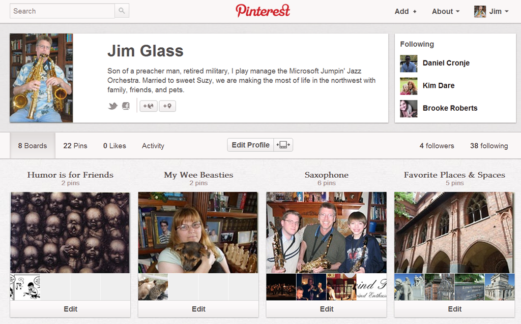 As many of my family and friends know, I am often on the leading edge of new social media trends. At my first company meeting with Amazon (I joined the team in January) I heard about the fastest growing social media company in the world, Pinterest. Here is how my site looks after a half hour of palying with it.