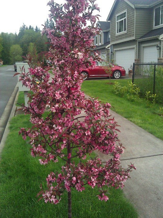 I was mowing the common area today and enjoying the new crab apple trees (three, count ‘em, three) I planted last month. It is the rainy season in the Seattle area so the grass is heavy and the trees happy.