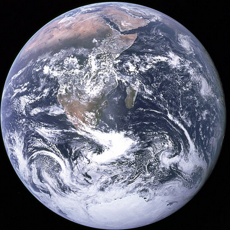 The original caption to this photo was, “View of the Earth as seen by the Apollo 17 crew traveling toward the moon. This translunar coast photograph extends from the Mediterranean Sea area to the Antarctica south polar ice cap. This is the first time the Apollo trajectory made it possible to photograph the south polar ice cap. Note the heavy cloud cover in the Southern Hemisphere. Almost the entire coastline of Africa is clearly visible. The Arabian Peninsula can be seen at the northeastern edge of Africa. The large island off the coast of Africa is Madagascar. The Asian mainland is on the horizon toward the northeast.” ~ Wikipedia