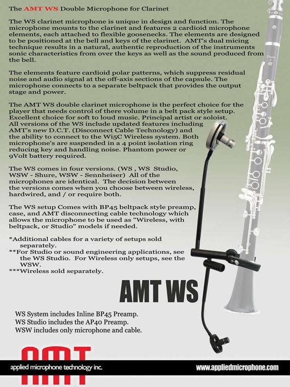 The AMT WS is Applied Microphone Technology’s flagship double microphone system for Clarinet. Designed, manufactured by hand, and distributed by AMT in the USA. The system is intended to clip onto standard Bb Clarinet’s.