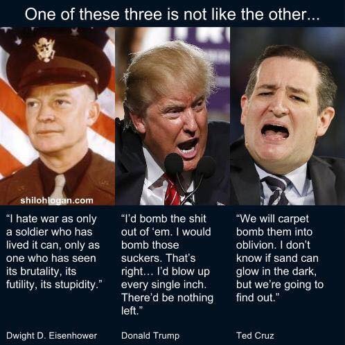 Good comparison, Jim. I think anyone with brains thinks that war that kills so many innocents, should not be the first choice of America. I fear that children in school more recently, were not taught how to think. I cannot imagine how they can be in favor of presidential candidates that see war as the answer to everything. Thanks for posting this.