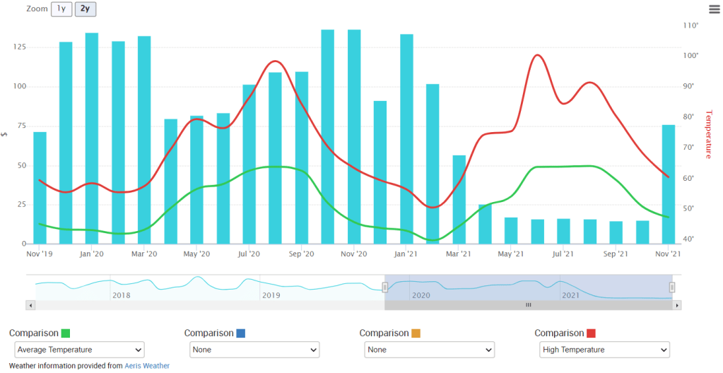 This chart shows power expenditure from Nov 2019 to Nov 2021. The first year is without solar. So we paid $640 less dollars this year over last. Note we got a slow start on the benefits but at that rate of savings it would take us 45 years to pay off the cost of solar panel installation. It is a much lower pay off rate than I had anticipated. But as the cost of electricity goes up, we might hope to break even much sooner. And you can cut that in half once we get the tax credit for the installation that I and my tax professional forgot to apply for last year!